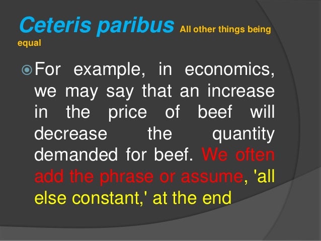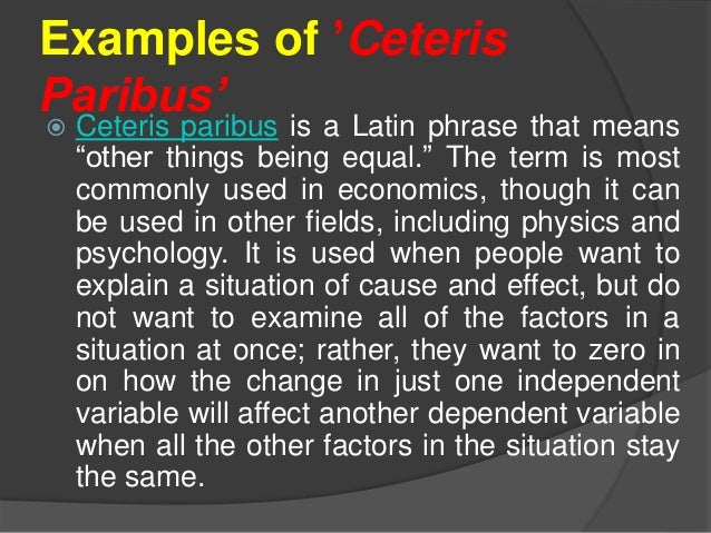 That is disregarding or eliminating extraneous factors in a situation. Ceteris paribus literally holding other things constant is a Latin phrase that is commonly translated into English as all else being equal A dominant assumption in mainstream economic. Ceteris paribus definition other things being equal.
